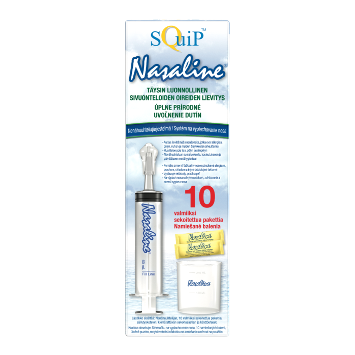 Laitteen puhdistus: Huuhtele Nasaline-nenähuuhtelija huolellisesti kuumalla vedellä. Nasalinen kestää myös mietoa astianpesuainetta. Anna kuivua ilmavassa paikassa. Nasaline-nenähuuhtelijan voi myös keittää kiehuvassa, väljässä vedessä noin kaksi minuuttia. Mikäli mäntä liikkuu huonosti ruiskun sisällä, mäntään voi laittaa muutaman tipan ruokaöljyä.