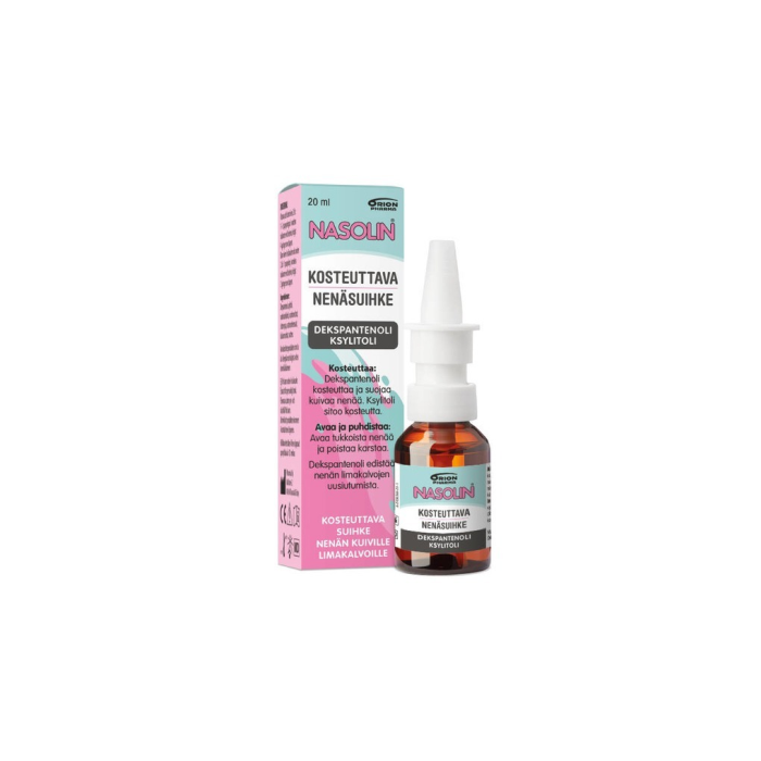 Nasolin kosteuttava nenäsuihke 20 ml on hoitosuihke nenän kuiville limakalvoille. Se kosteuttaa, avaa ja puhdistaa kuivaa, karstaista ja tukkoisen oloista nenää. Nasolin kosteuttava nenäsuihke sisältää vaikuttavina aineina dekspantenolia ja ksylitolia. CE-merkitty lääkinnällinen laite, valmistaja Pharmia Oy.